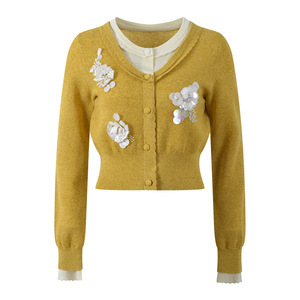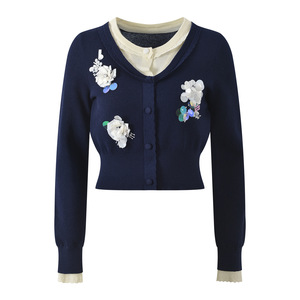 2025秋季新款立体花朵珠片装饰撞色假两件时尚减龄显瘦针织开衫