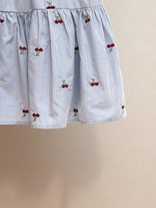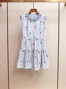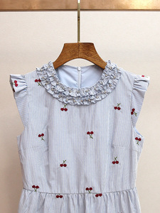 深圳南油高端女装秋季新款法清新减龄钉珠花边领樱桃条纹连衣裙女