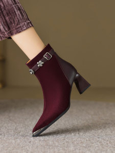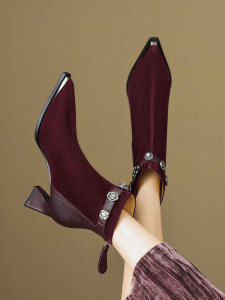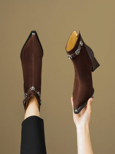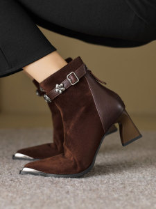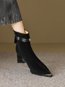 巨好穿短靴女春秋单靴2025新款尖头高跟靴粗跟水钻磨砂