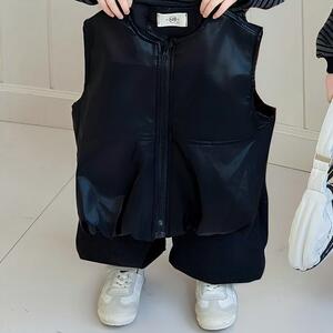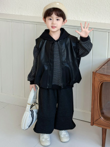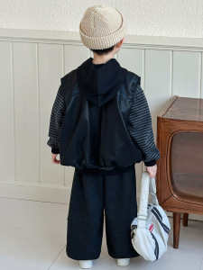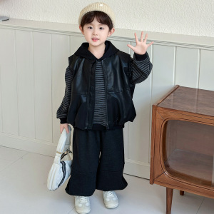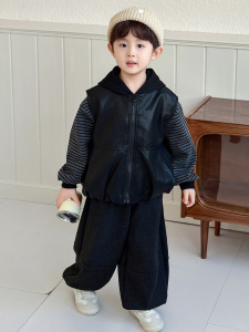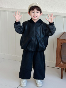 男童秋季套装2025新款酷帅儿童装长袖卫衣秋款男孩皮衣马甲三件套
