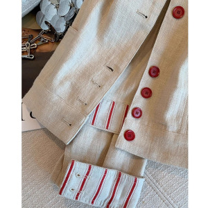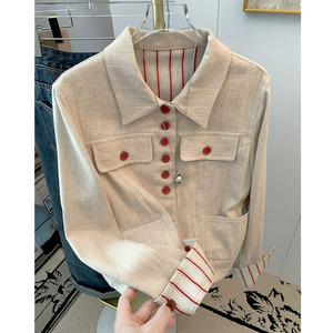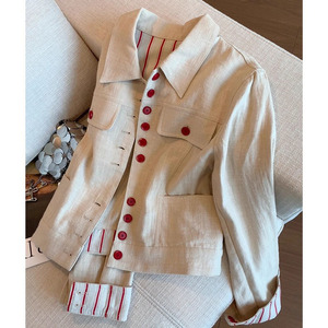 老钱风条纹拼接亚麻短外套女2025秋新款高级感洋时尚休闲百搭上衣