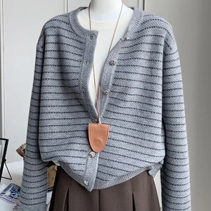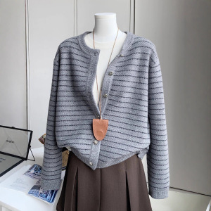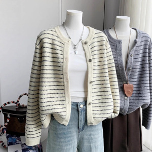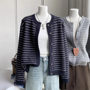 小香风百搭条纹针织开衫2025春秋新款女装宽松高级感叠穿毛衣外套