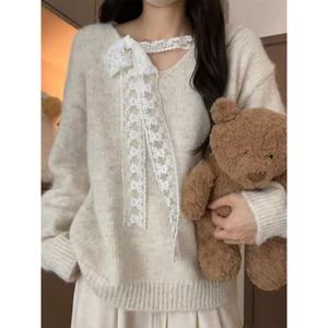 蕾丝蝴蝶结系带v领毛衣女秋冬季2025新款慵懒高级感内搭针织上衣