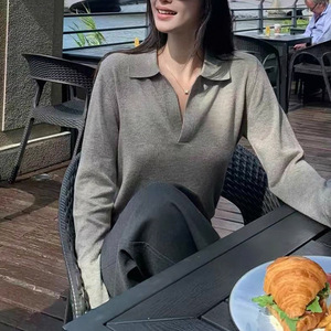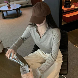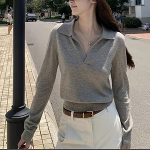 韩系灰色POLO衫正肩长袖针织衫女早秋气质高JI感短款修身翻领上衣
