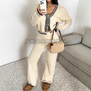 欧美跨境2025秋冬撞色V领上衣裤套装宽松时尚优雅减龄两件套
