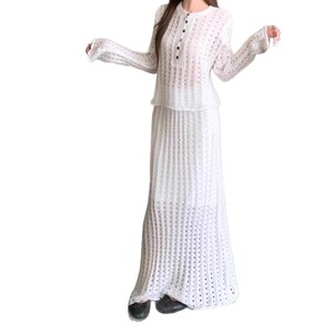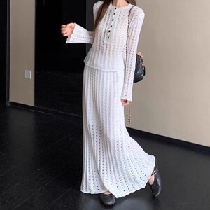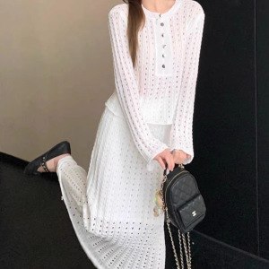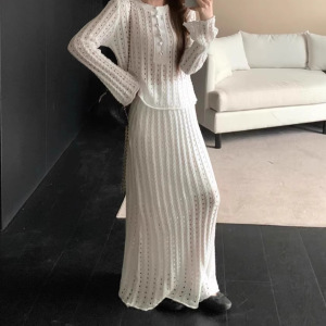 设计感白色镂空长袖针织衫女装秋季2025新款显瘦半身裙长裙两件套