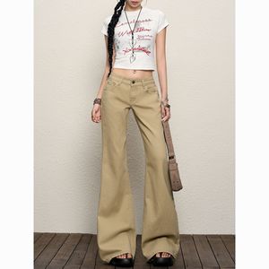 韩版小个子卡其色低腰微喇牛仔裤女夏新款复古辣妹显瘦垂感拖地裤