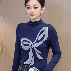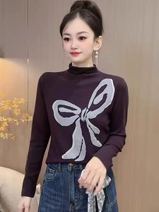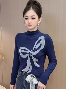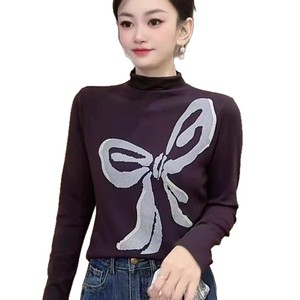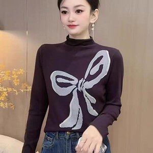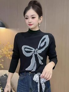 一件代发2025秋季新款时尚半高领洋气百搭蝴蝶结印花打底衫上衣女