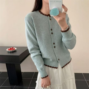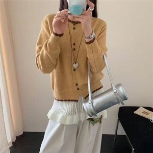 撞色温柔风休闲软糯花边针织开衫女秋季新款宽松气质长袖毛衣外套