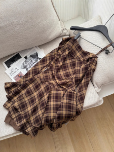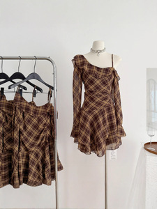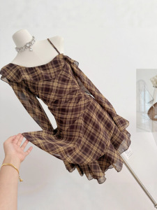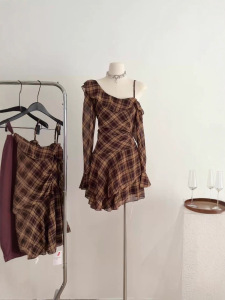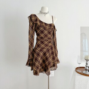 『欣幸』法式复古荷叶边格纹连体裙女秋不规则收腰气质小个子短裙