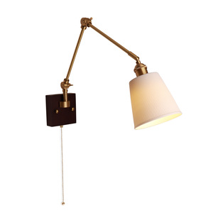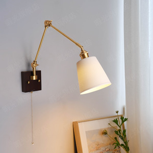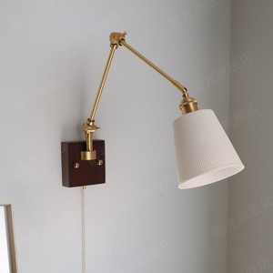 法式复古胡桃木色客厅背景墙实木壁灯侘寂风卧室床头黄铜摇臂壁灯