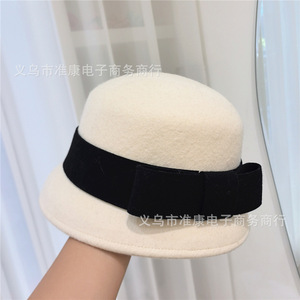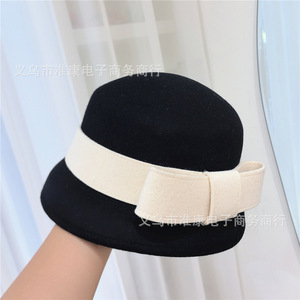 名媛气质款盆帽法式复古羊毛呢蝴蝶结渔夫帽优雅出街小檐毡帽秋冬