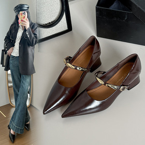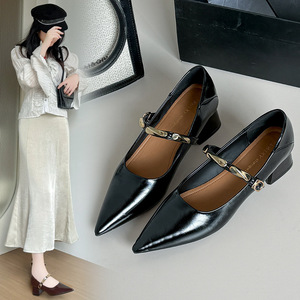 法式气质黑色尖头粗跟玛丽珍鞋女鞋子2025春秋季新款软皮黑色单鞋