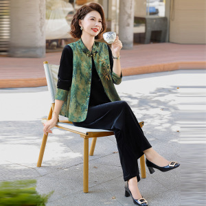 妈妈秋装新中式套装阔太太国风马甲上衣中老年女装气质丝绒三件套
