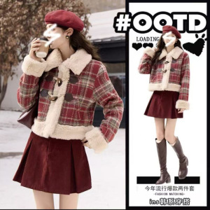 2025秋冬季新款圣诞法式小香风高级设计感格子保暖娃娃领外套百搭