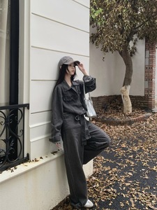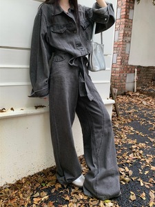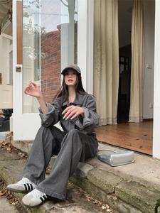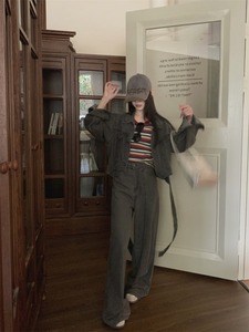 复古时尚牛仔套装女夏季2025新款长袖外套条纹上衣阔腿裤子三件套