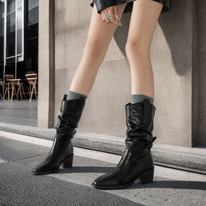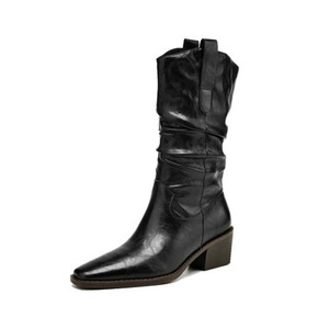 美拉德风真皮短靴女秋冬长靴堆堆靴中筒靴骑士靴粗跟西部牛仔靴