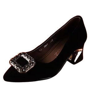 秋季新款舒适尖头水钻浅口尖头鞋百搭气质黑色粗跟不累脚通勤单鞋
