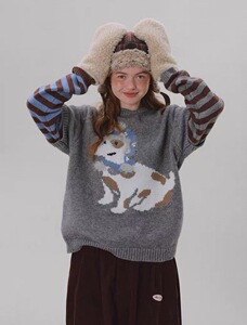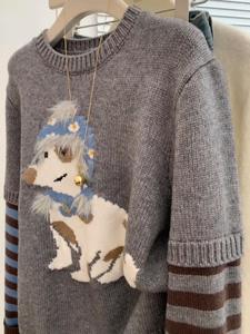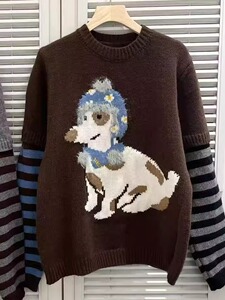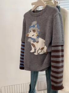 时尚条纹拼接针织假两件外套2025秋冬新款韩系宽松小狗刺绣毛衣女