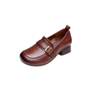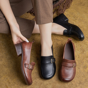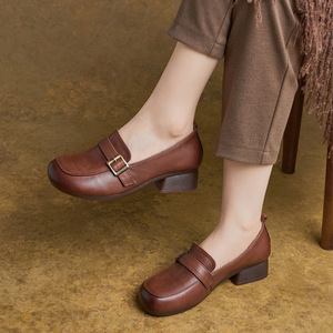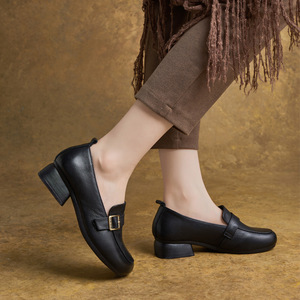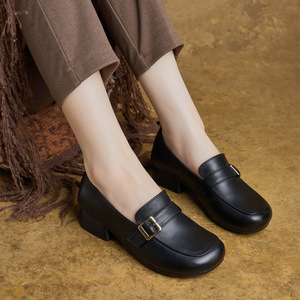 2025年秋季复古圆头扣带深口单鞋乐福鞋女魔术贴英伦风粗跟小皮鞋