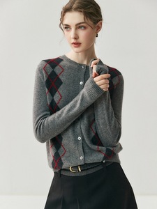 品质羊绒!秋冬款女士气质文艺百搭圆领开衫女菱形格羊绒外套