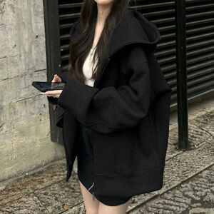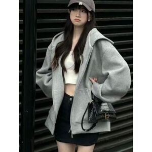 美式复古灰色连帽开衫卫衣女加绒加厚设计感宽松情侣拉链外套上衣