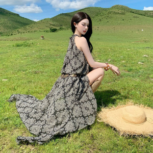 法式复古印花不规则挂脖连衣裙女夏季海边度假风设计感收腰短裙子