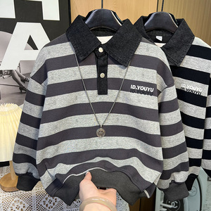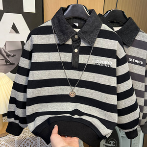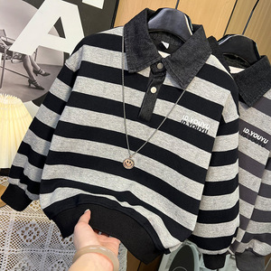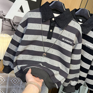 男童洋气复古条纹牛仔POLO领卫衣2025春秋中大童休闲宽松儿童上衣