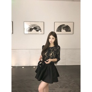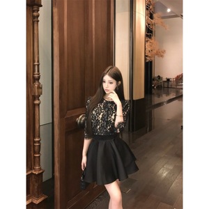 黑色镂空中袖蕾丝衫上衣女早秋穿搭套装御姐轻熟气质半身裙两件套