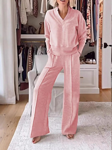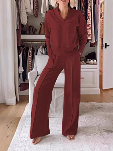 2025秋冬亚马逊跨境欧美新款V领长袖宽松纯色女式时尚休闲裤套装