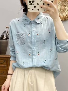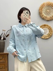 高端刺绣长袖衬衫女25文艺小清新甜美圆领蕾丝口袋百搭双层纱衬衣