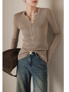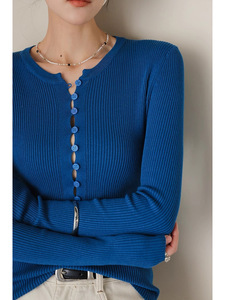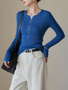 蓝色长袖半开领针织衫女2025年秋季新款修身显瘦上衣