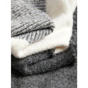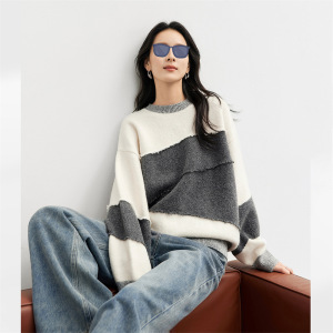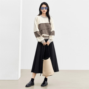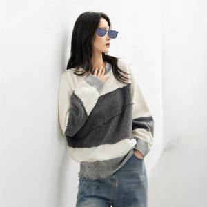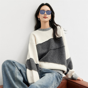 对白绵羊毛混纺简约撞色拼接圆领毛衣女2025冬新款宽松套头针织衫
