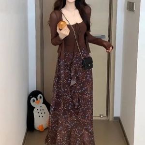 秋季2025复古小香风新款咖色三件套长袖开衫吊带上衣碎花半身裙女