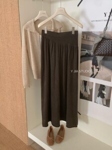 Y.JIA 伊嘉-秋季韩系设计感不规则斜裁褶皱收腰针织半身裙女388-5