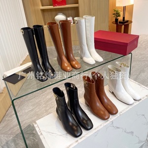 高品质新款欧美方头粗跟切尔西靴骑士靴V字金属logo低跟廋廋靴女