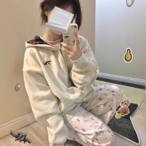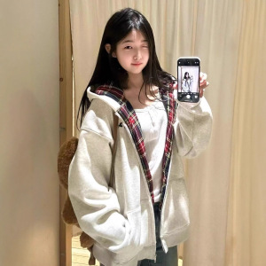 2025春秋季新款美式潮流休闲百搭宽松拼接格子连帽卫衣外套