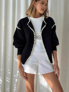 2025秋季新款圆领珍珠镶边针织衫短款长袖重工开衫毛衣时尚外套女