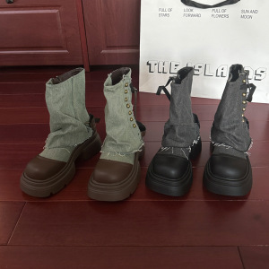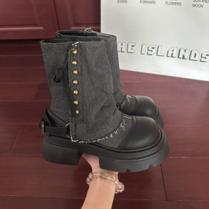 设计感~厚底裤管靴女2025新款秋冬季西部牛仔复古堆堆中筒马丁靴