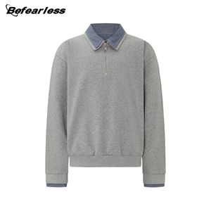美式复古重磅格子拼接polo领短宽长袖卫衣男女假两件半拉链外套潮
