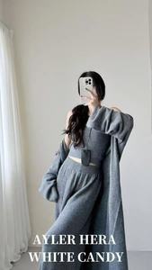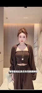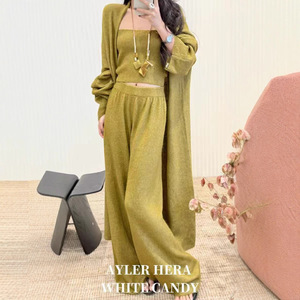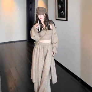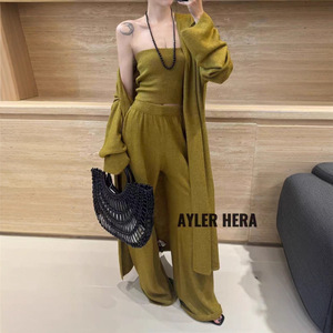 2025秋季慵懒风纯色内搭抹胸外搭中长款开衫女高腰直筒裤套装