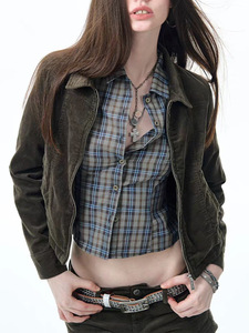 细灯芯绒夹克复古做旧翻领上衣秋季慵懒风辣妹收腰短外套女
