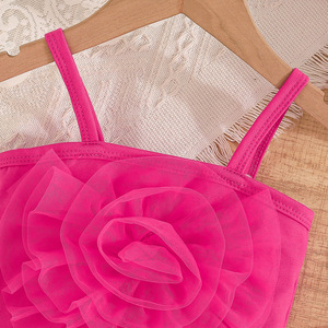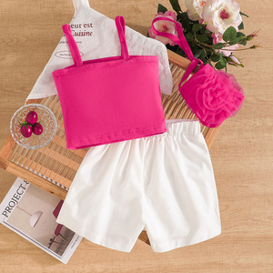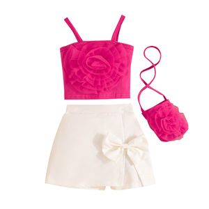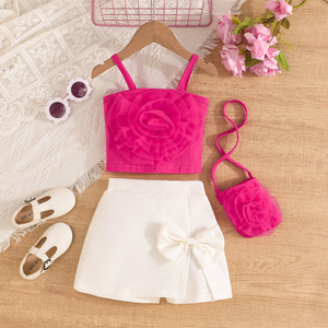 跨境专供—女童夏款玫粉立体花吊带 + 蝴蝶结裙裤 +花朵挎包套装