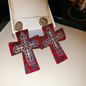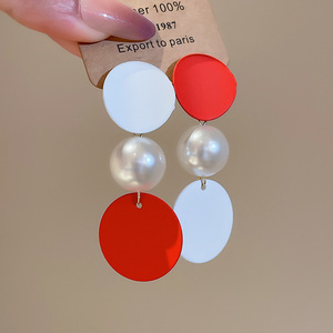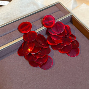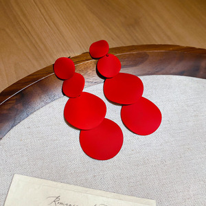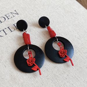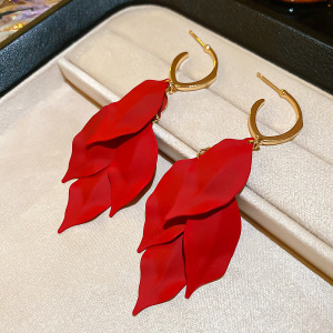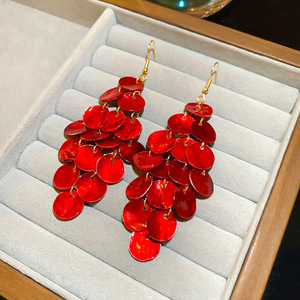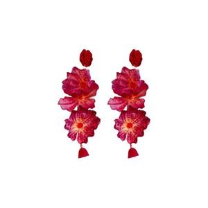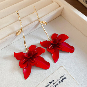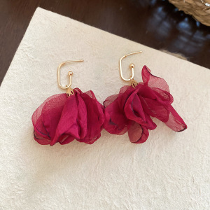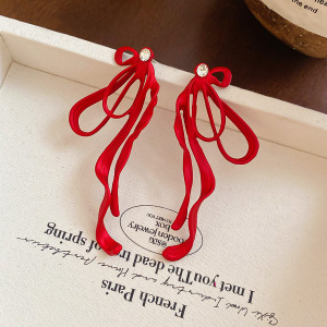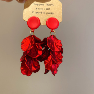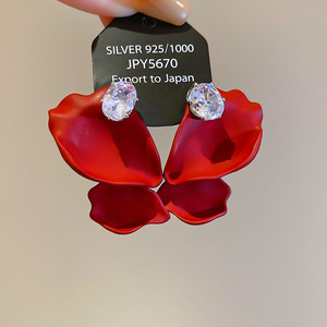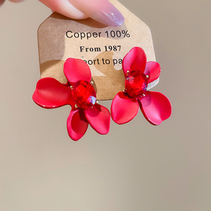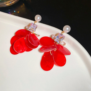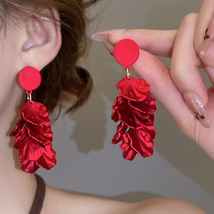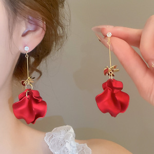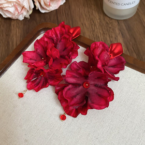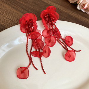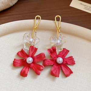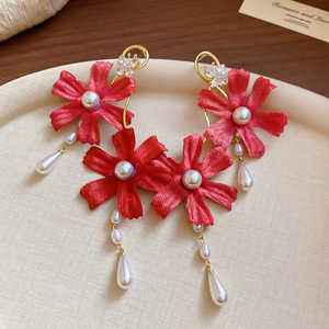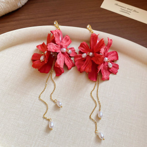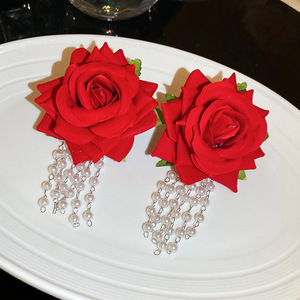 度假风红色布艺玫瑰花流苏珍珠耳环轻奢高级感耳钉气质夸张耳饰女