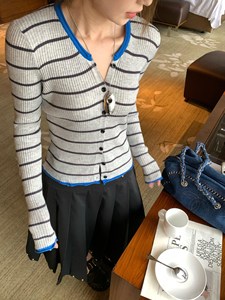 早秋穿搭深蓝色条纹针织上衣女秋季新款内搭打底衫设计小众