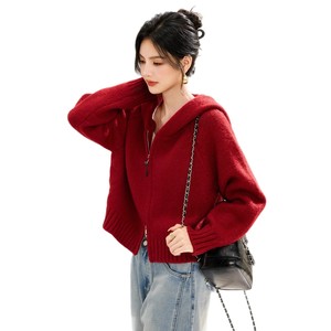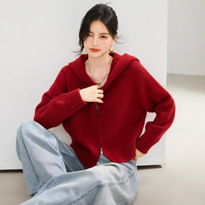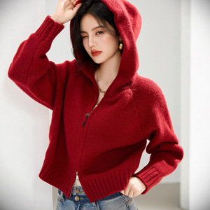拉链复古红色毛衣女连帽外套设计感小众宽松针织洋气短款开衫秋冬
