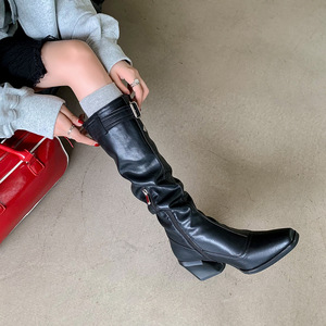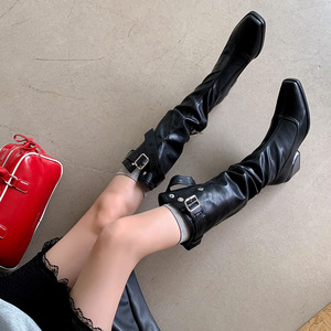 zijin家~可两穿粗高跟侧拉链时装长靴25年秋冬款皮带扣褶皱高筒靴