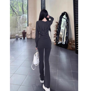 2025高级感连帽系带T恤上衣女秋季新款休闲微喇叭长裤子运动套装