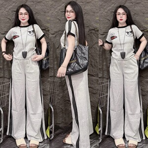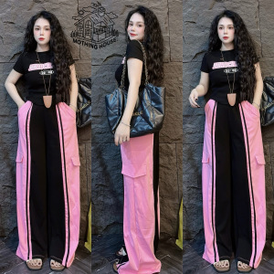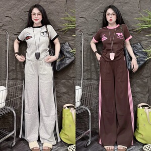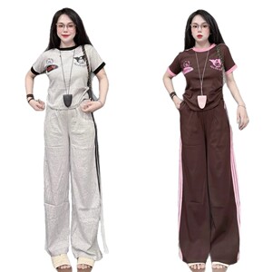 东南亚女士时尚套装夏季新款卡通拼色短袖T恤侧条纹阔腿裤两件套