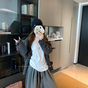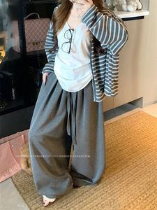 实拍 2025秋季韩版百搭休闲慵懒风简约条纹v领开衫外套+背心+长裤